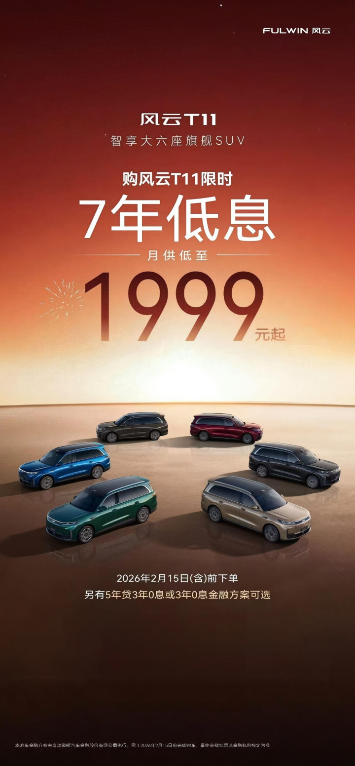 1月28日,奇瑞汽车官方针对奇瑞风云T11推出7年低息购车方案,月供低至1999元起,活动有效期截止2月15日(含)前下单。